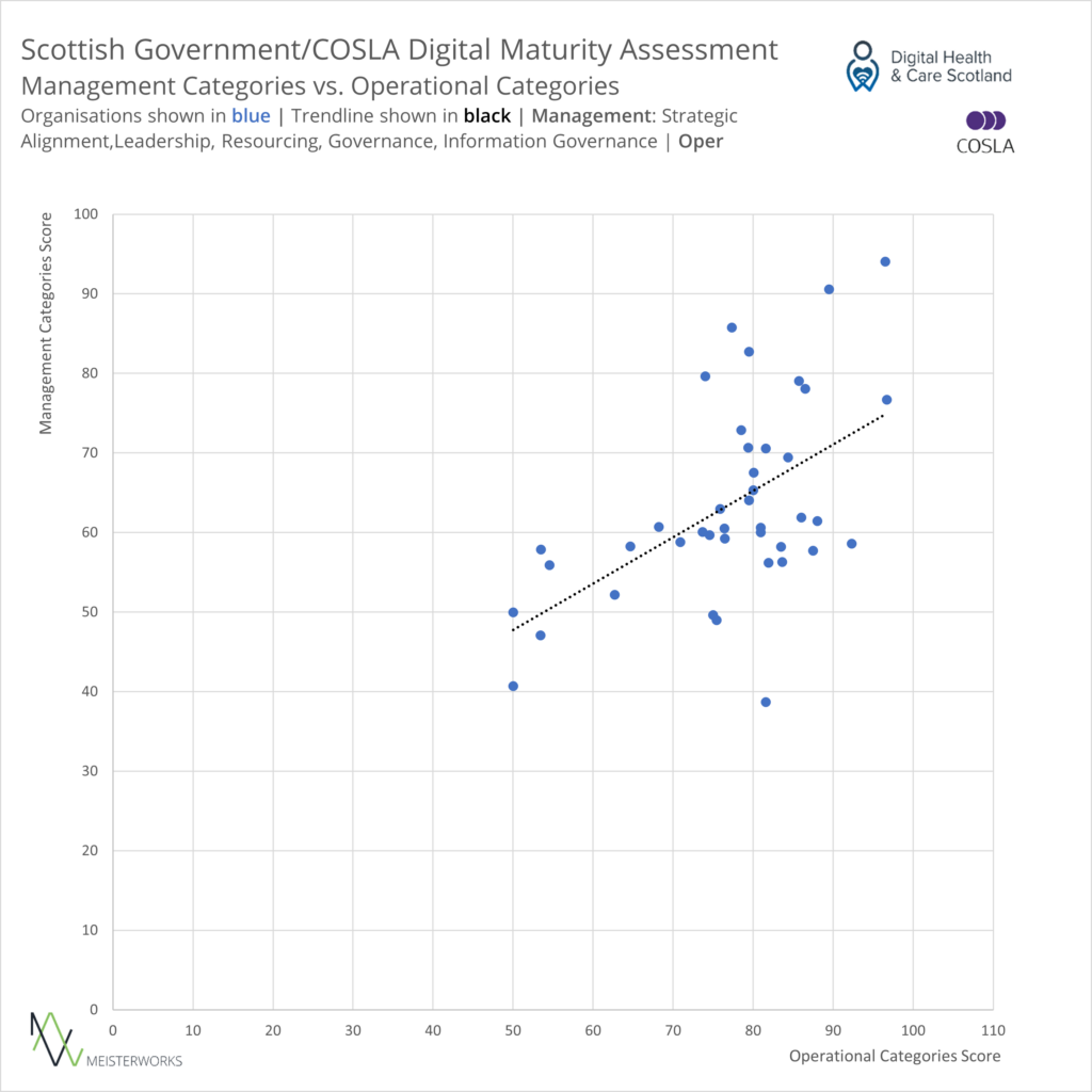 [This image shows a scatter chart. The chart depicts organisations’ scores in management categories on the y-axis and operational categories on the x-axis.]