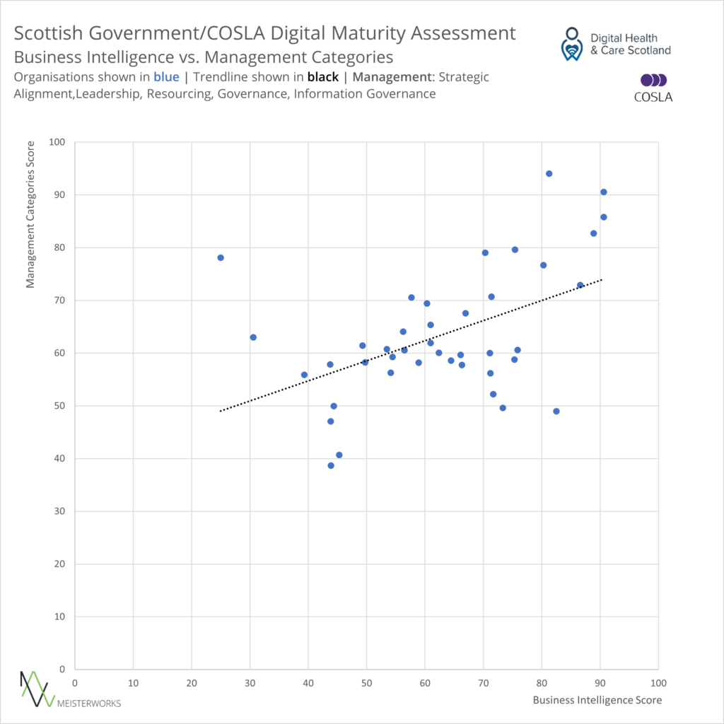 Organisations who scored high in the Business and Clinical Intelligence category tended to also score higher for management-related categories (Strategic Alignment, Leadership, Resourcing, Governance, Information Governance), supporting the hypothesis that data-driven approaches support better management of digital transformation and digital operations.